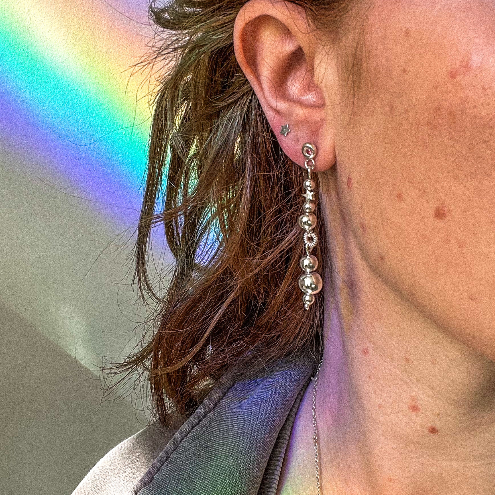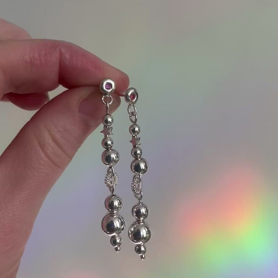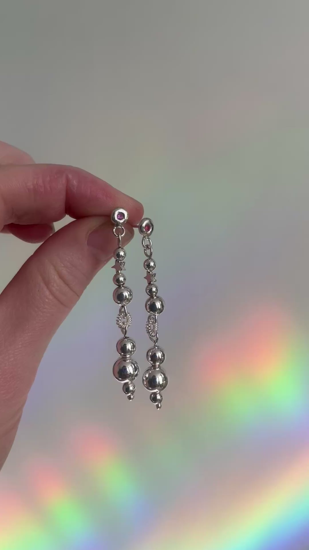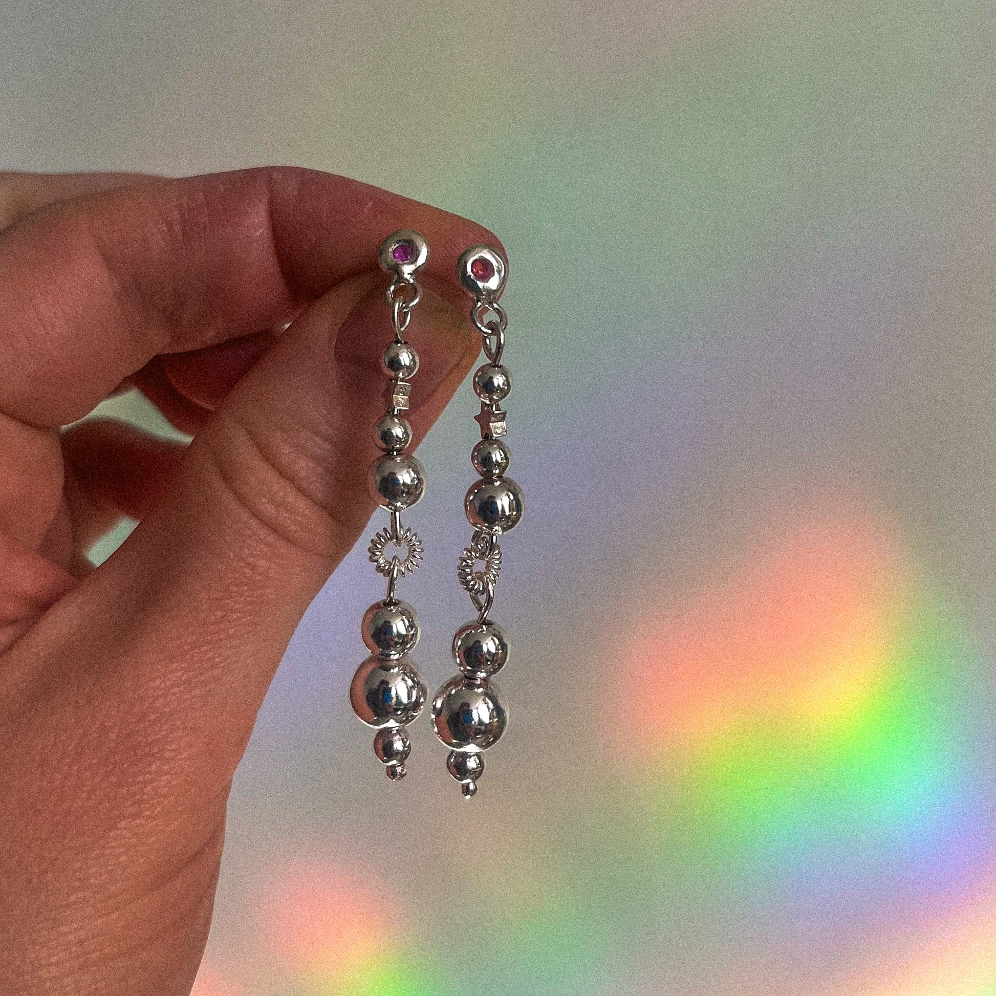 Sterling silver, long dangly earrings with a mishmash of silver beads and pink sapphires (the pinks of the sapphires are slightly different)