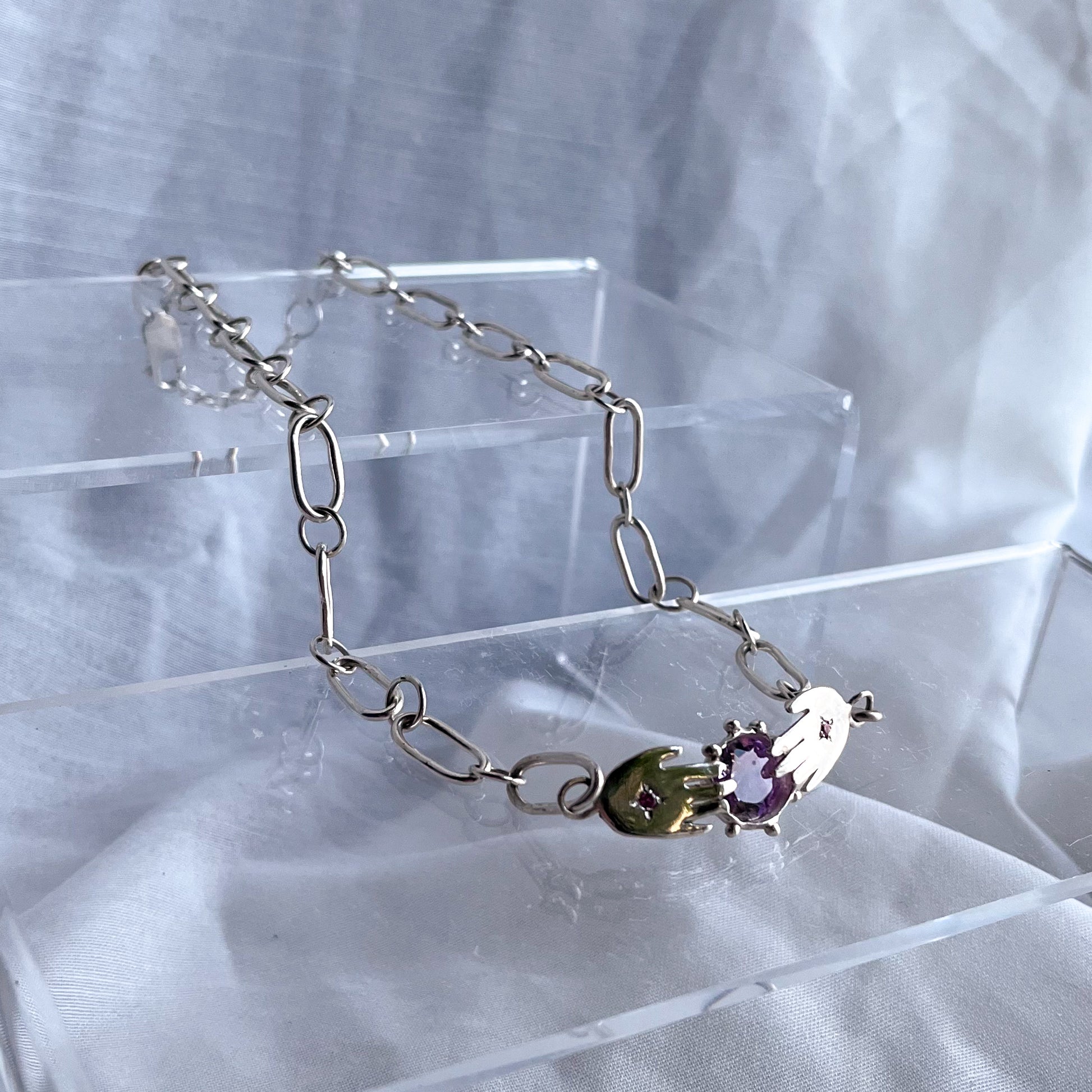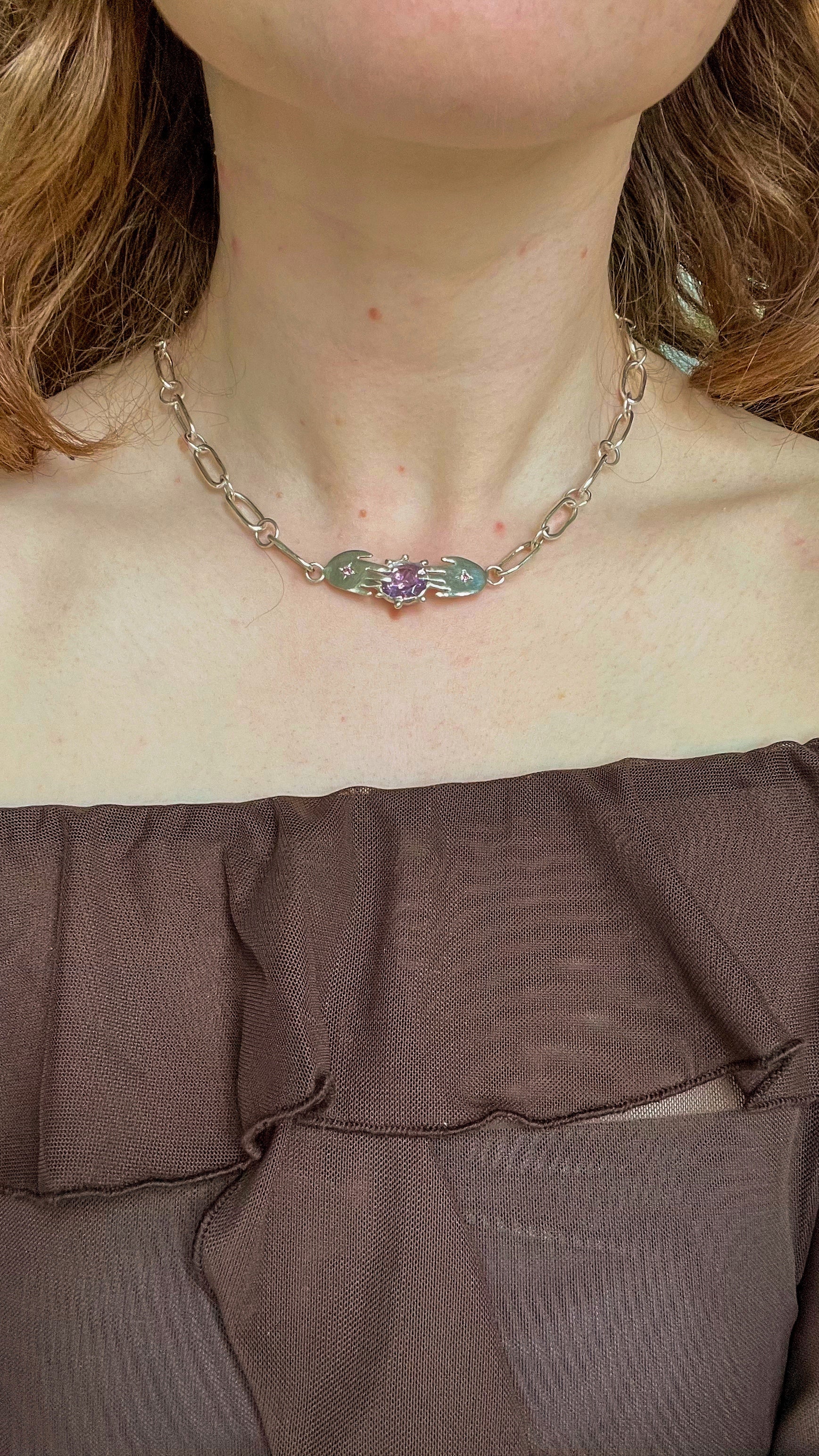 An accidental recreation of síle na gig, each link in this piece is hand formed surrounding two hands that hold a very large amethyst stone. Two pink sapphires are set into the centre of the hands. On the rear of the amethyst setting is a carved star and moon that can only be seen by the wearer.