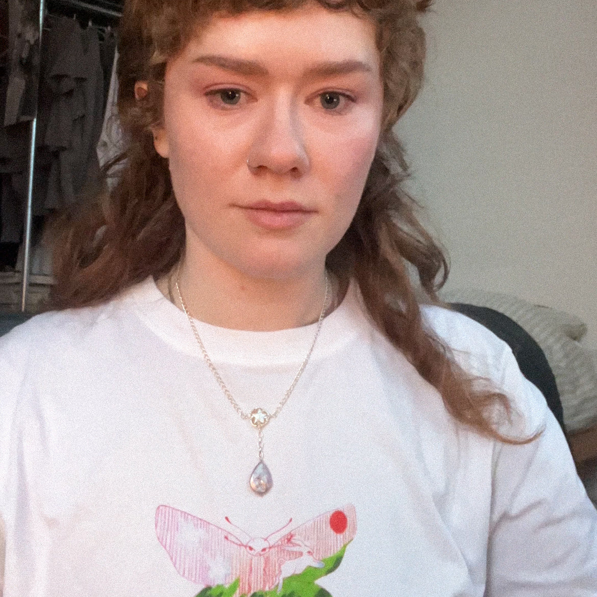 sterling silver cable chain holding a star shaped pearl and purple pear pearl
