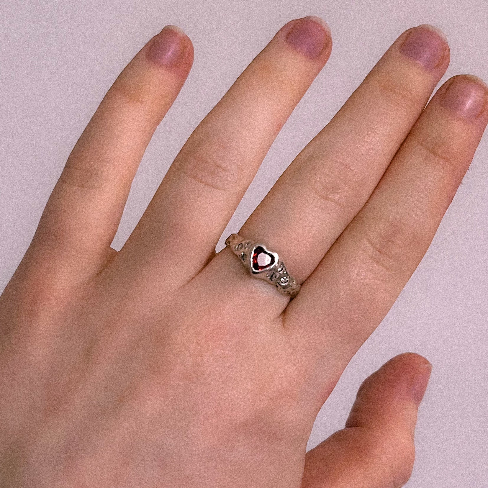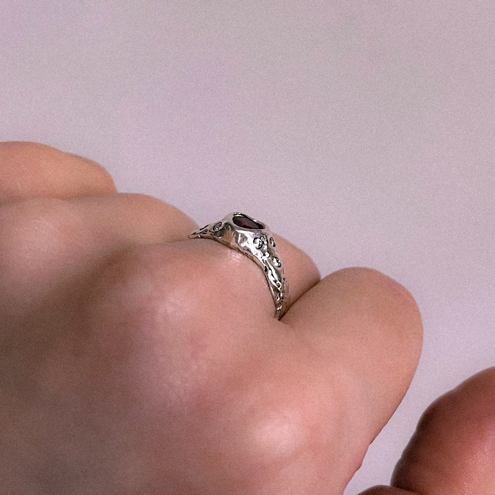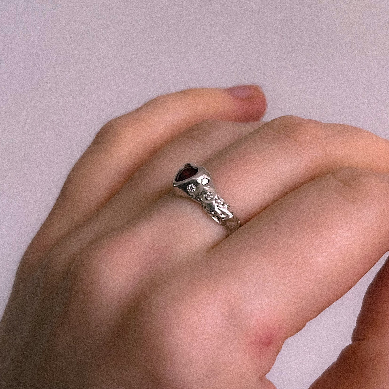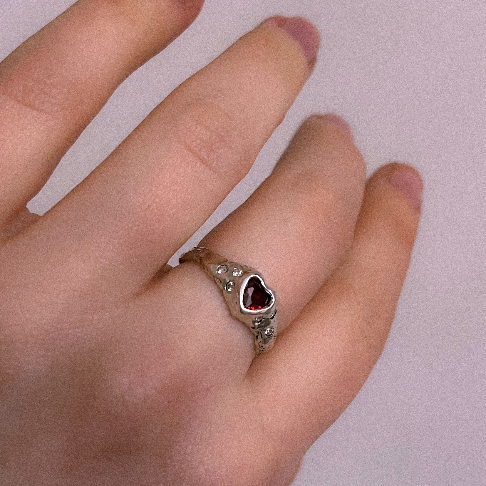 heart shaped cubic zirconia with 3 moissanites either side in a molten, organic style setting