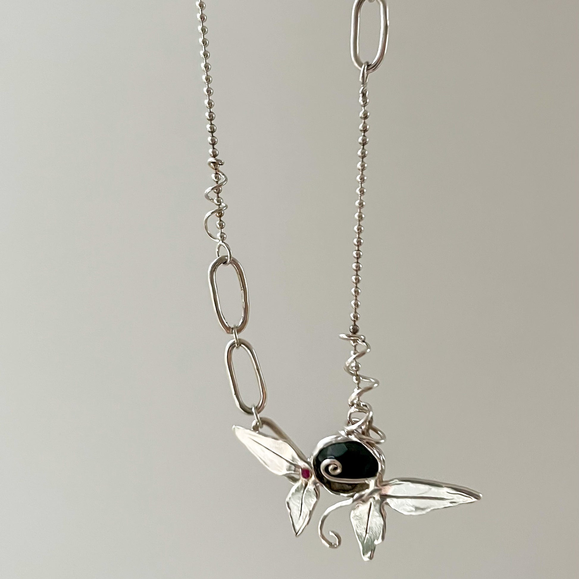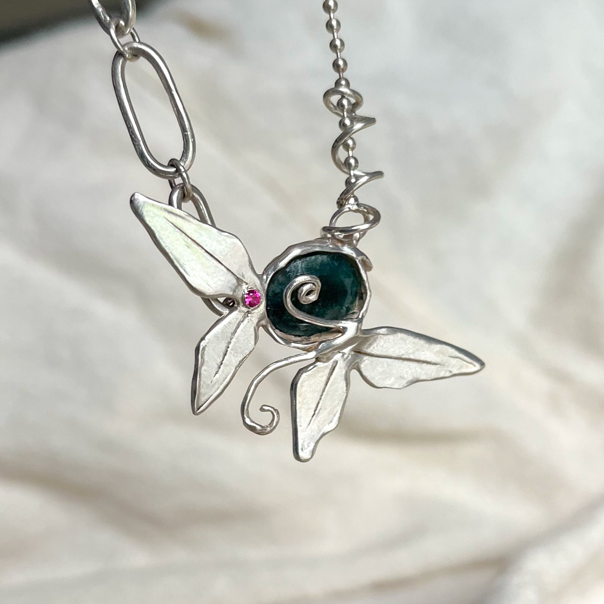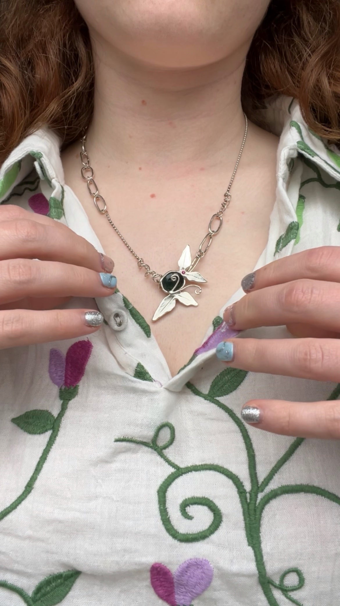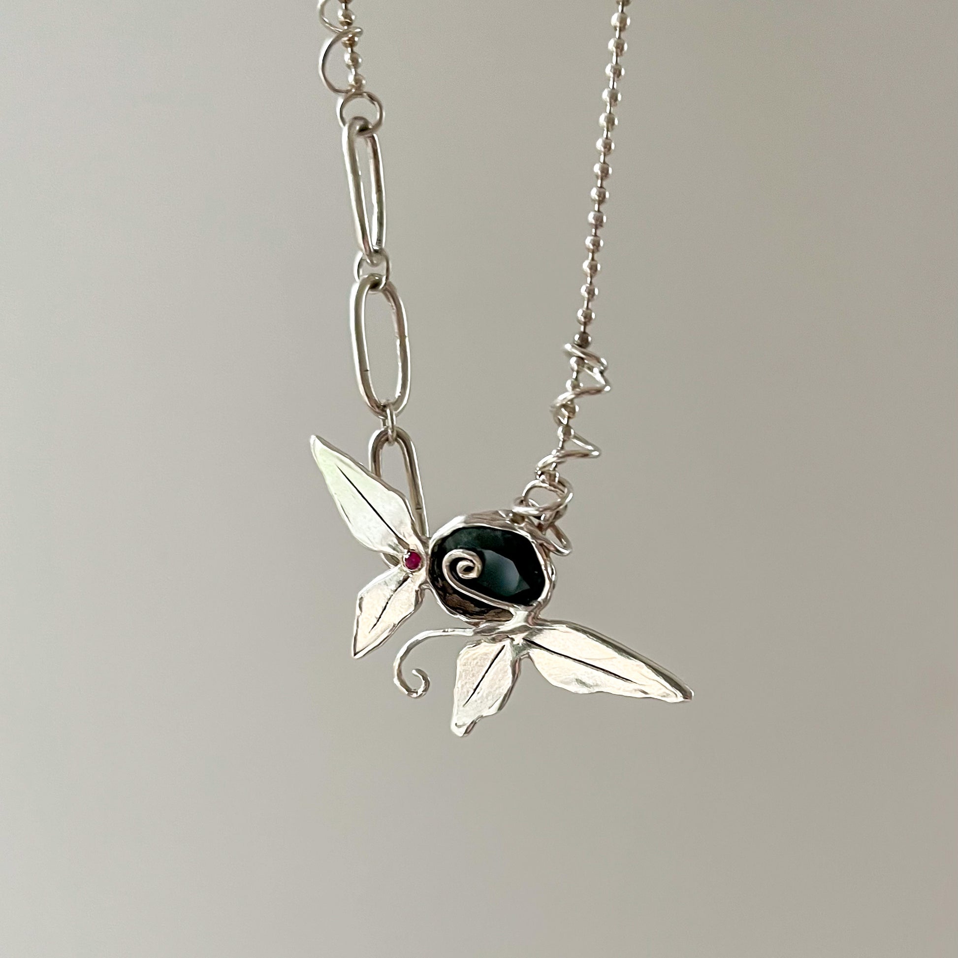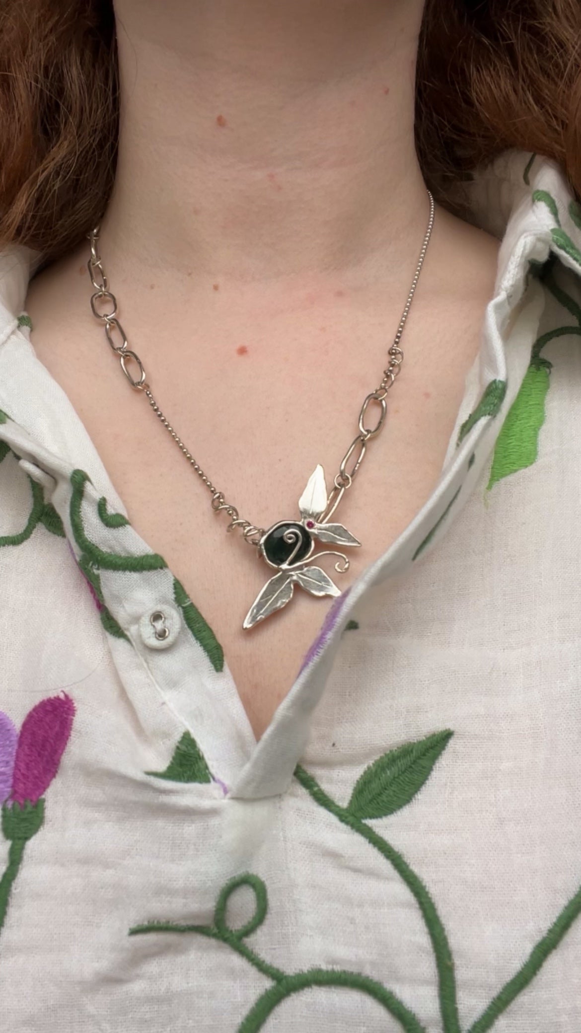 Inspired by the sweet peas growing in my garden, a large moss agate and small ruby are wrapped in sterling silver with a mixed chain with little tendrils of silver. Chain measures 16 inches in length.